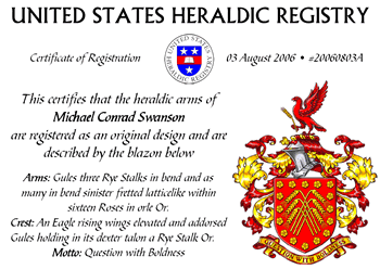 This certifies that the heraldic arms of Michael Conrad Swanson are registered as an original design and are described by the blazon below